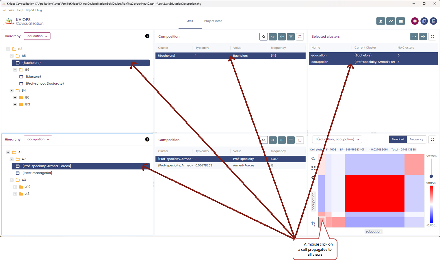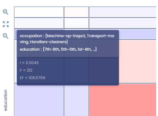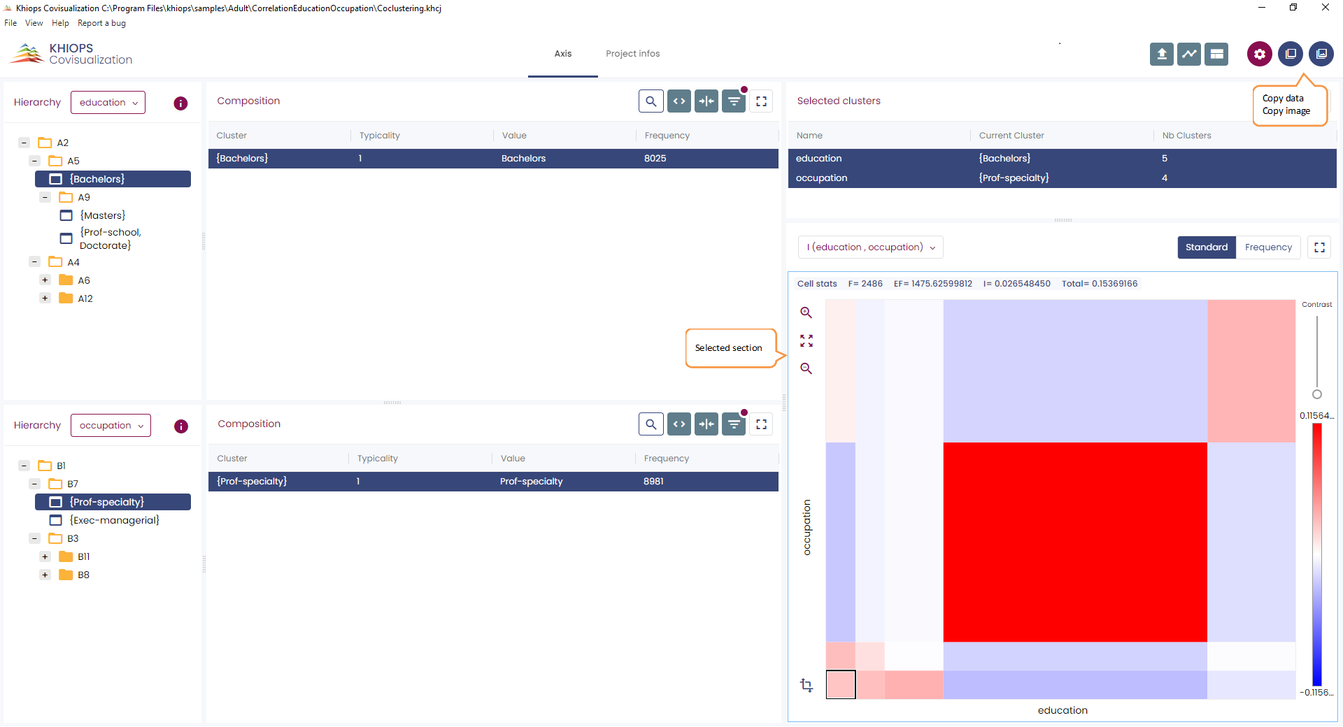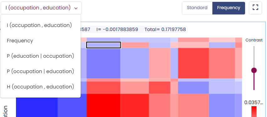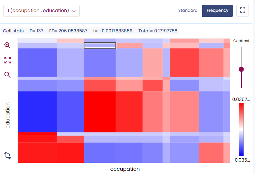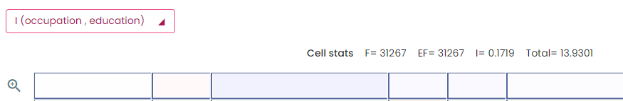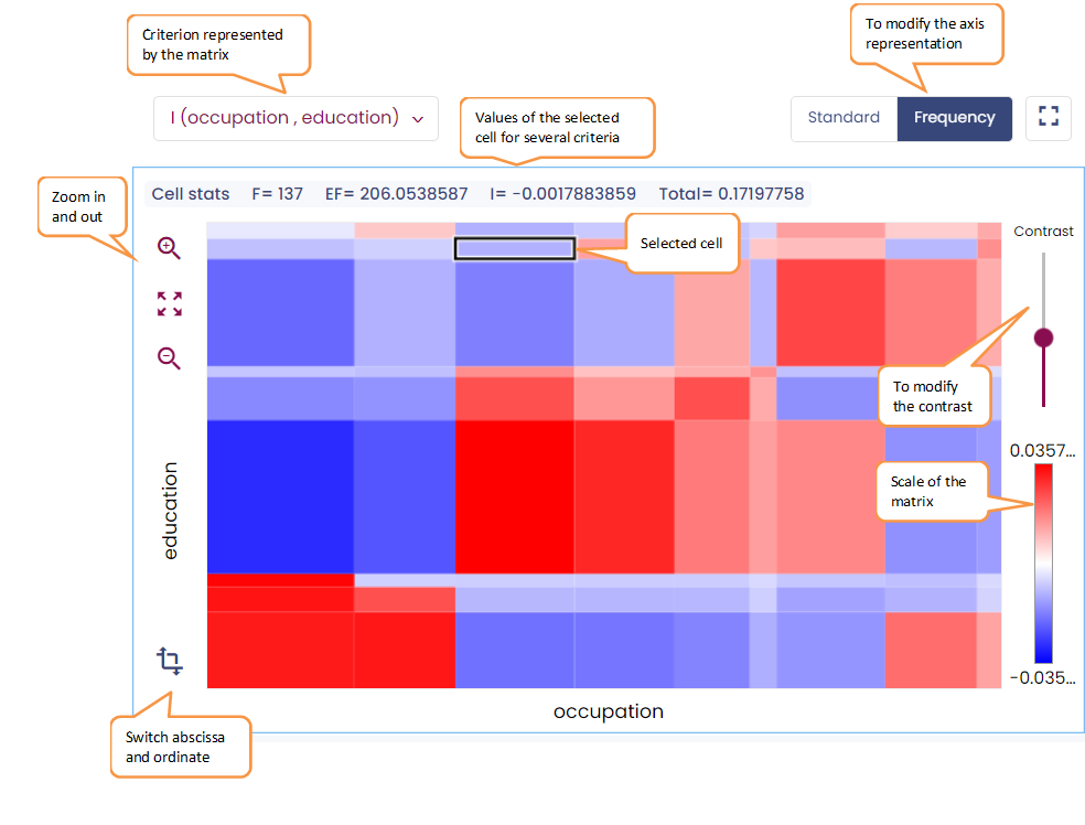 Above the matrix, the value of the selected cell for the current criterion is shown as well as its frequency and its expected frequency in case of independence of the two dimensions (EF). Moreover when the criterion is the mutual information, the total mutual information is displayed.