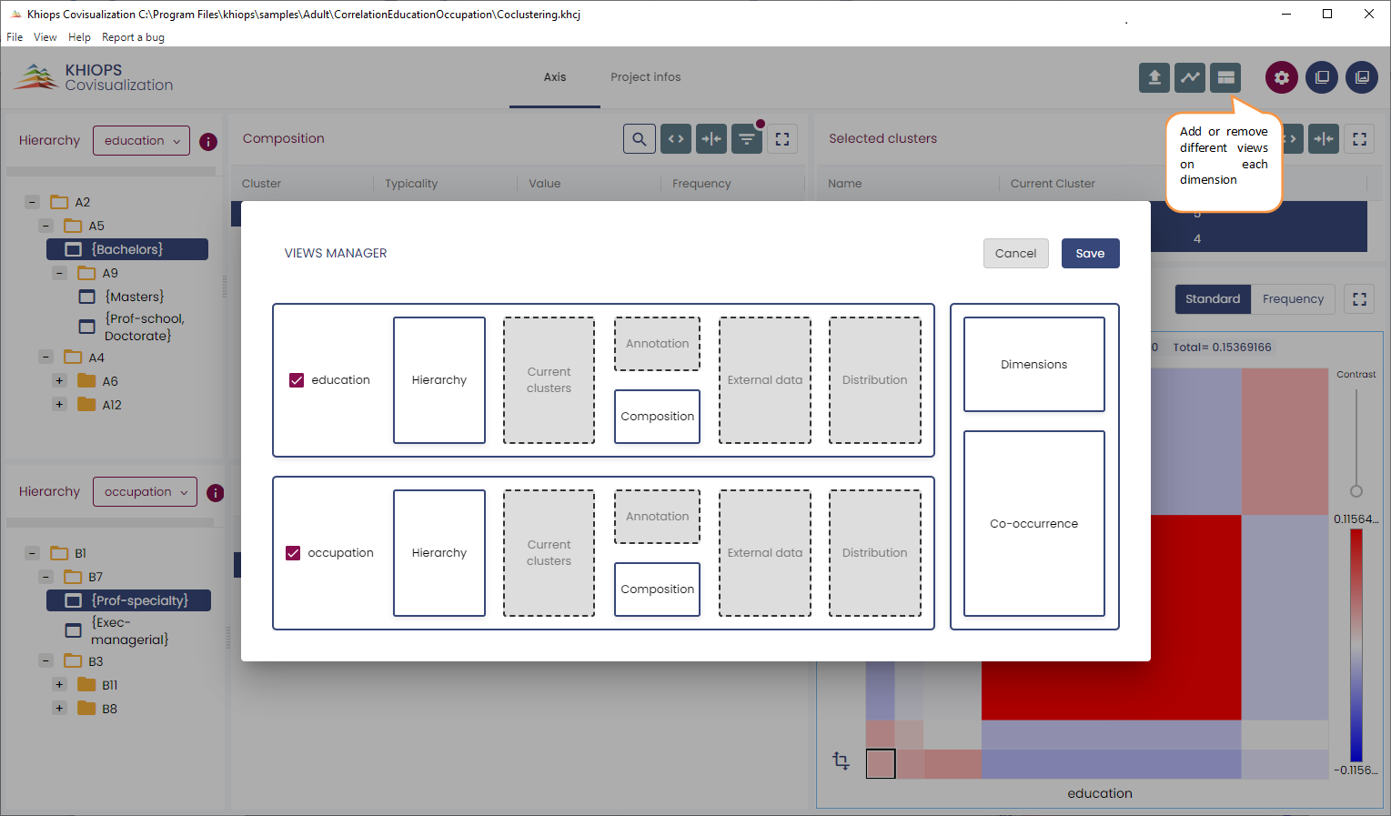 If the khcj file is too big to be visualized in Khiops Covisualization, you can simplify the coclustering with Khiops Coclustering