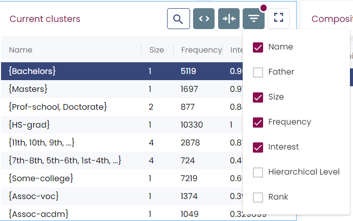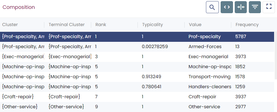 Given a selected cluster in the hierarchy view, the composition view presents in a table all value items (value in the dimension) which are grouped in this cluster. An item belongs to a cluster if it belongs to one of its sub-cluster.