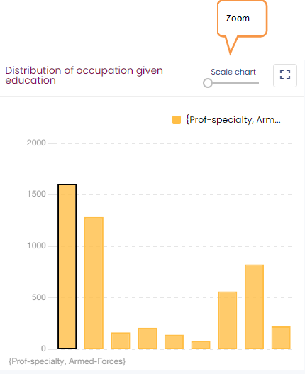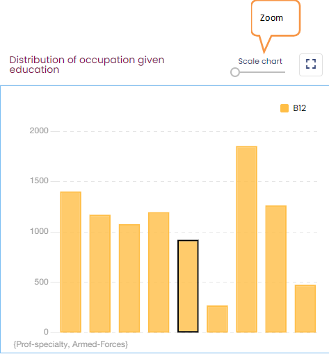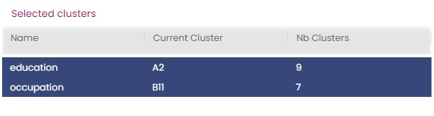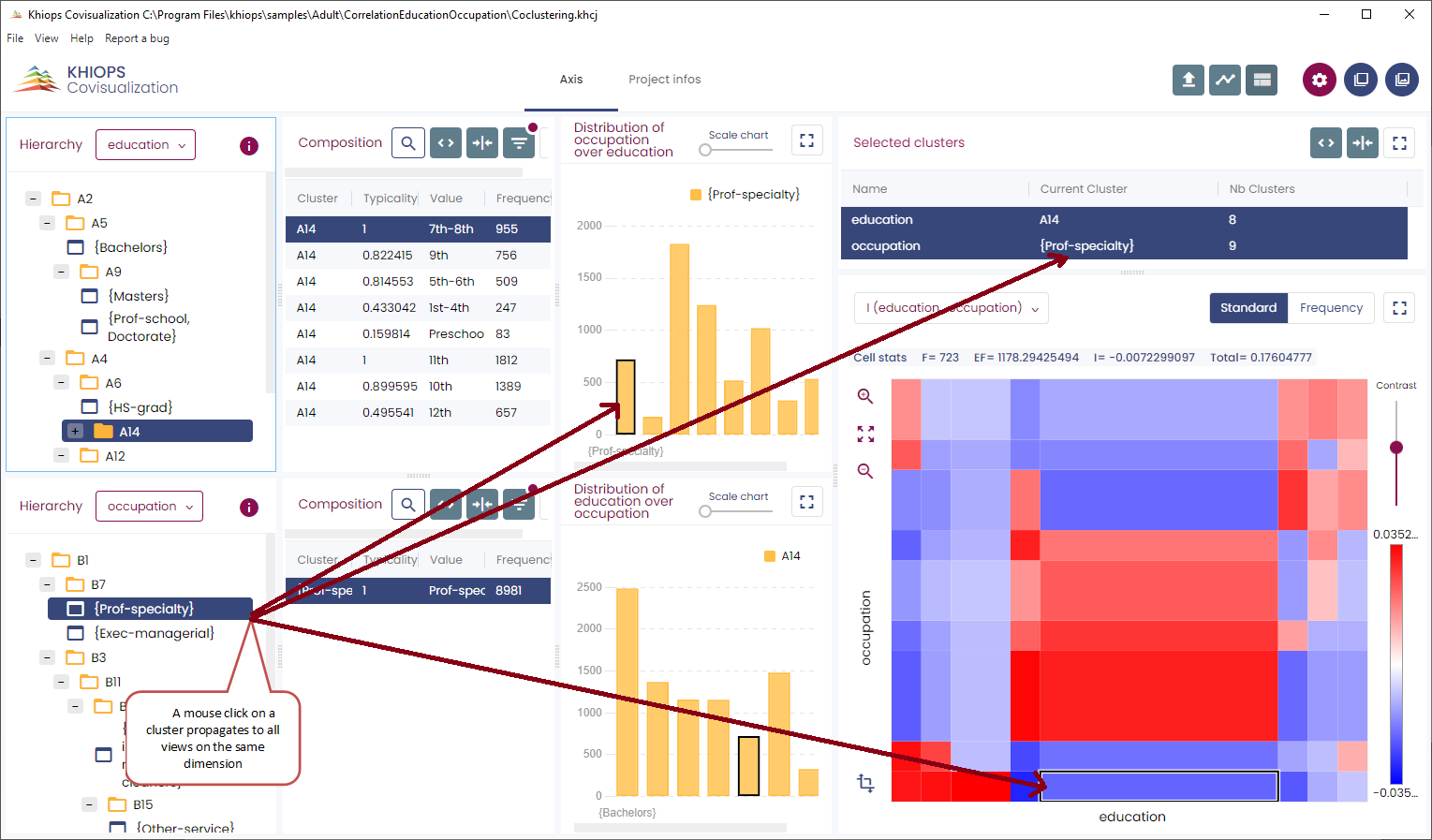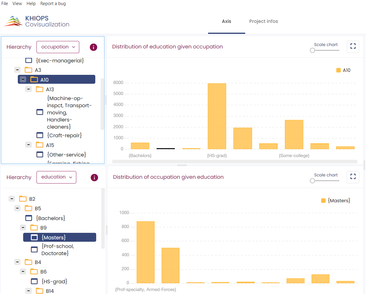 In the example below, the upper histogram represents the distribution of “education” given the selected cluster “A10” of occupation. The lower histogram represents the distribution of “occupation” given the selected cluster “Masters” of “education”.