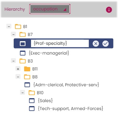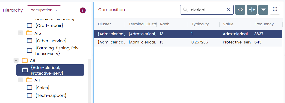 The search edit box allows finding values in the selected cluster. You can find all items containing the substring entered in the search edit box. In the example below, the user finds the item with value “clerical”. In the hierarchy, the cluster “Adm-clerical, Protec ..” is highlighted; this is the cluster that owns this item.