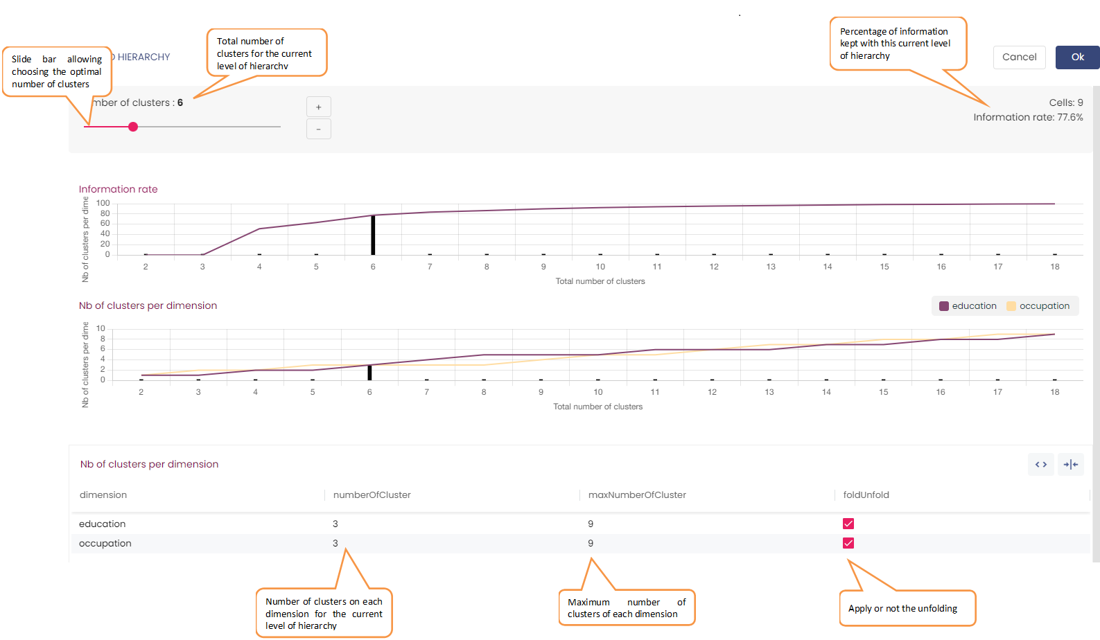 This window allows choosing the best number of clusters on both dimensions: optimal unfolding of each partition so as to keep the most informative model. The top chart shows the evolution of the level according to the number of clusters, that is the percentage of information kept at each granularity of the hierarchy. This allows obtaining a simplified and easily interpretable hierarchy with few clusters while keeping most of the information. In real cases, 80% of the information often comes from a small fraction of the clusters.