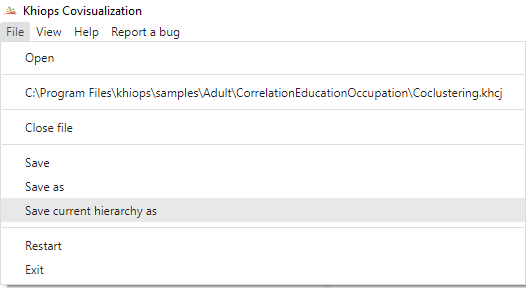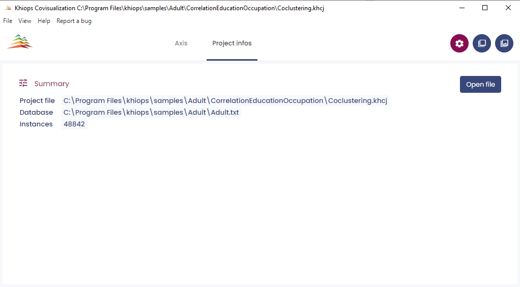 The entry point of Khiops Covisualization is the khcj file generated by Khiops Coclustering at the end of the analysis. A double-click on this file opens Khiops Covisualization.