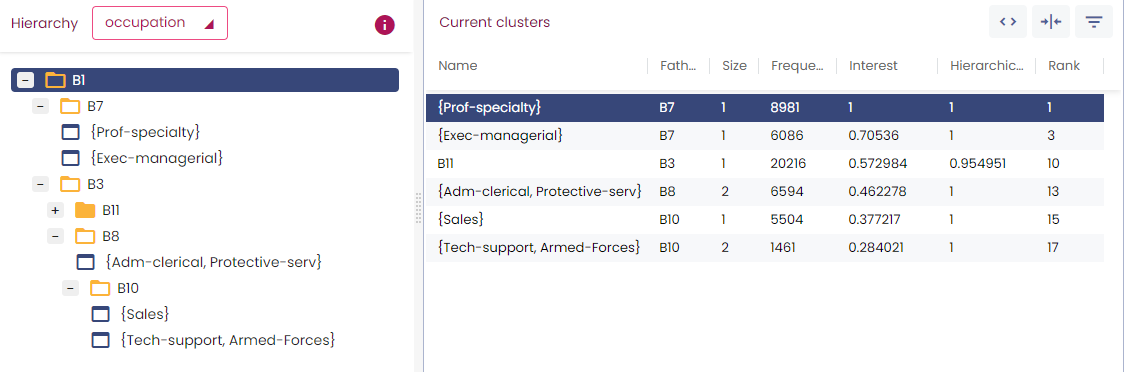 Once the number of clusters is chosen (and therefore the information kept with the coclustering), by clicking the button "Ok", you return to the main window where the hierarchies are now unfolded.