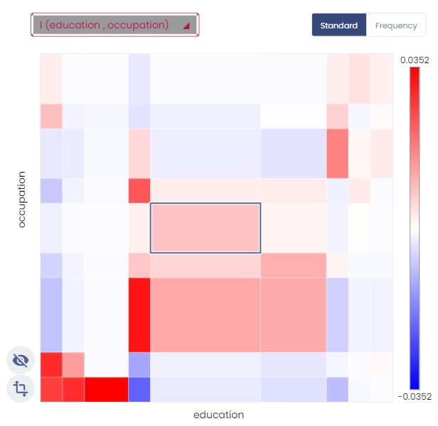 By default, the axis of the matrix represent the cluster size: range of the interval in case of a numerical cluster and number of values in the group in case of a categorical cluster. You can choose another representation with the button below the matrix. By choosing "Frequency", the axis represent the frequency of the clusters.