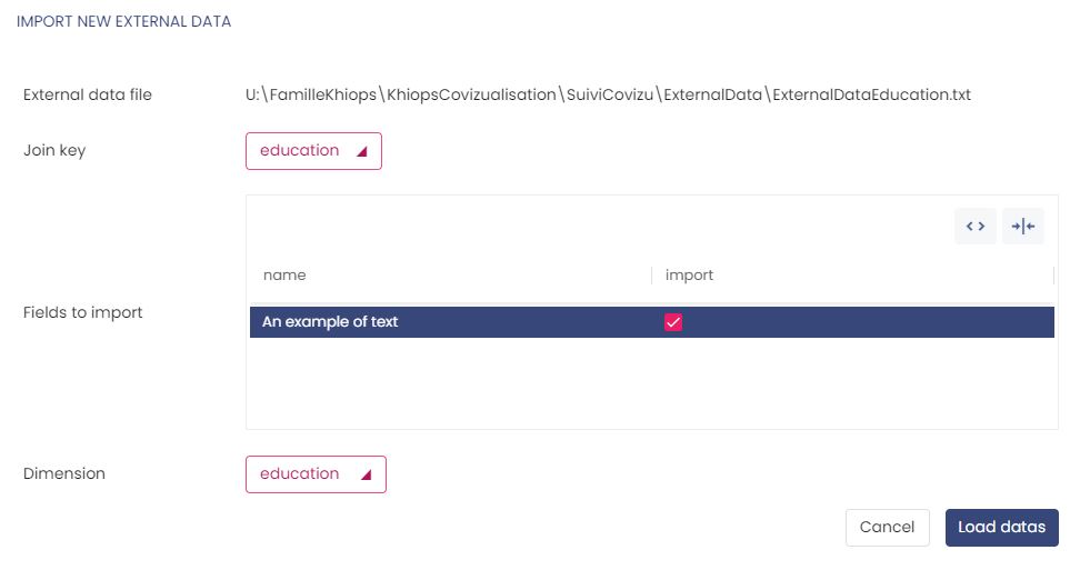 Once the file location is filled, you have to choose the join key among the columns of the file and the dimension to which the data belongs. After the import ("Load datas" button), Khiops Covisualization displays these data in the "external data" view.