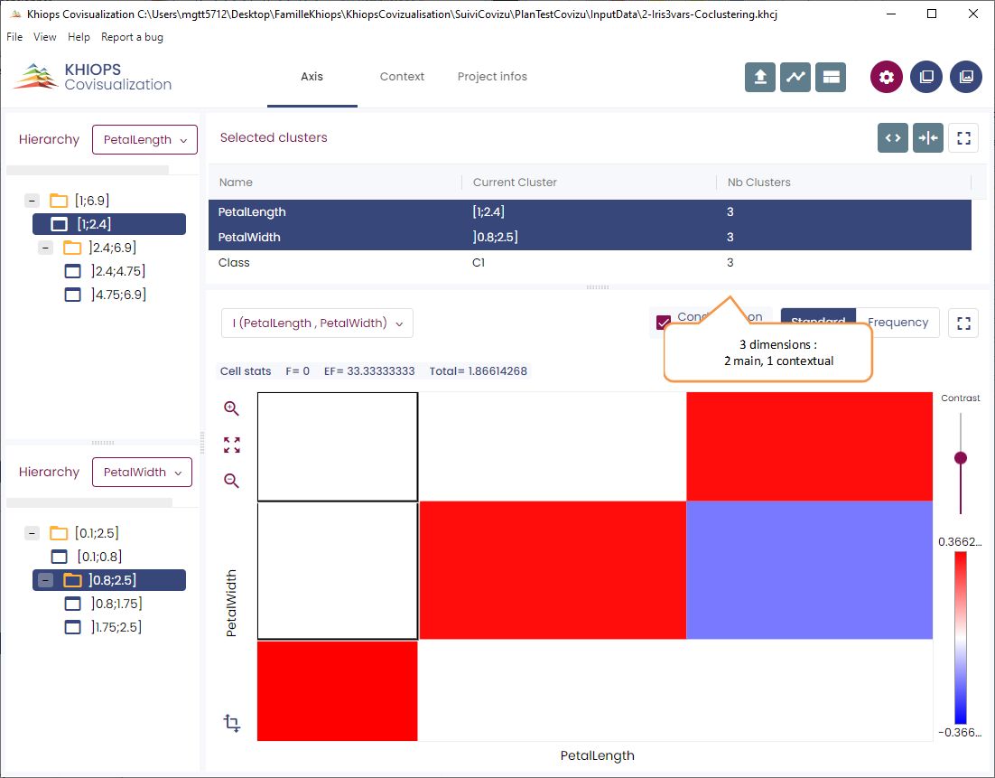 The coclustering window in the Axis panel is split into three mains parts; there is one part for each variable (or dimension). The right part shows a co-occurrence matrix.