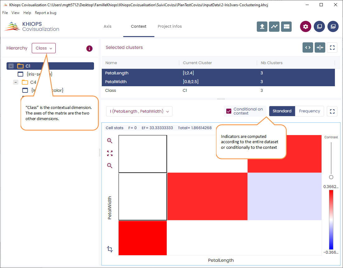 If the "Conditional on context" button is checked, the indicators are computed with the instances associated to the context selected cluster