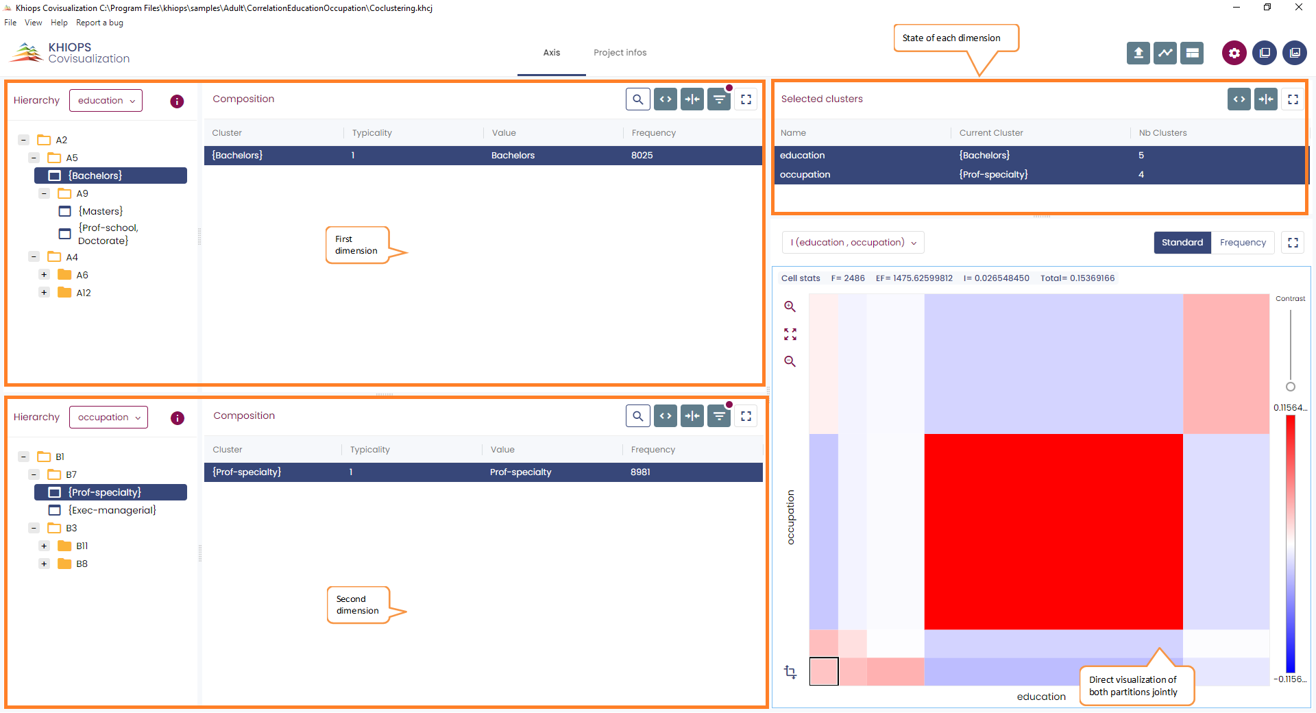 Khiops covisualization allows to explore coclustering of more than 2 dimensions: these features are detailed in the section Managing three dimensions or more.