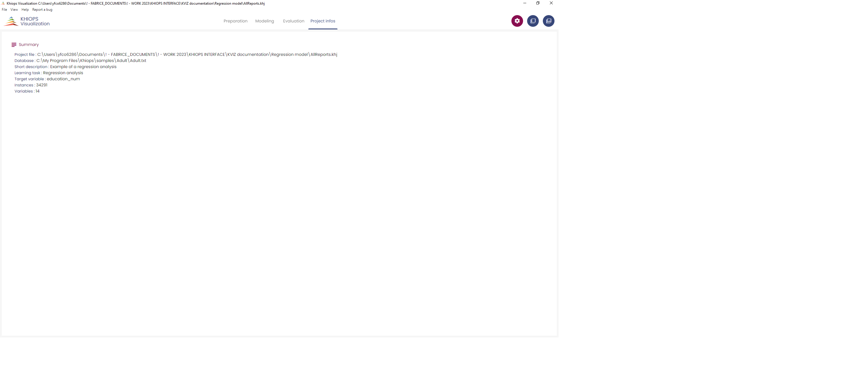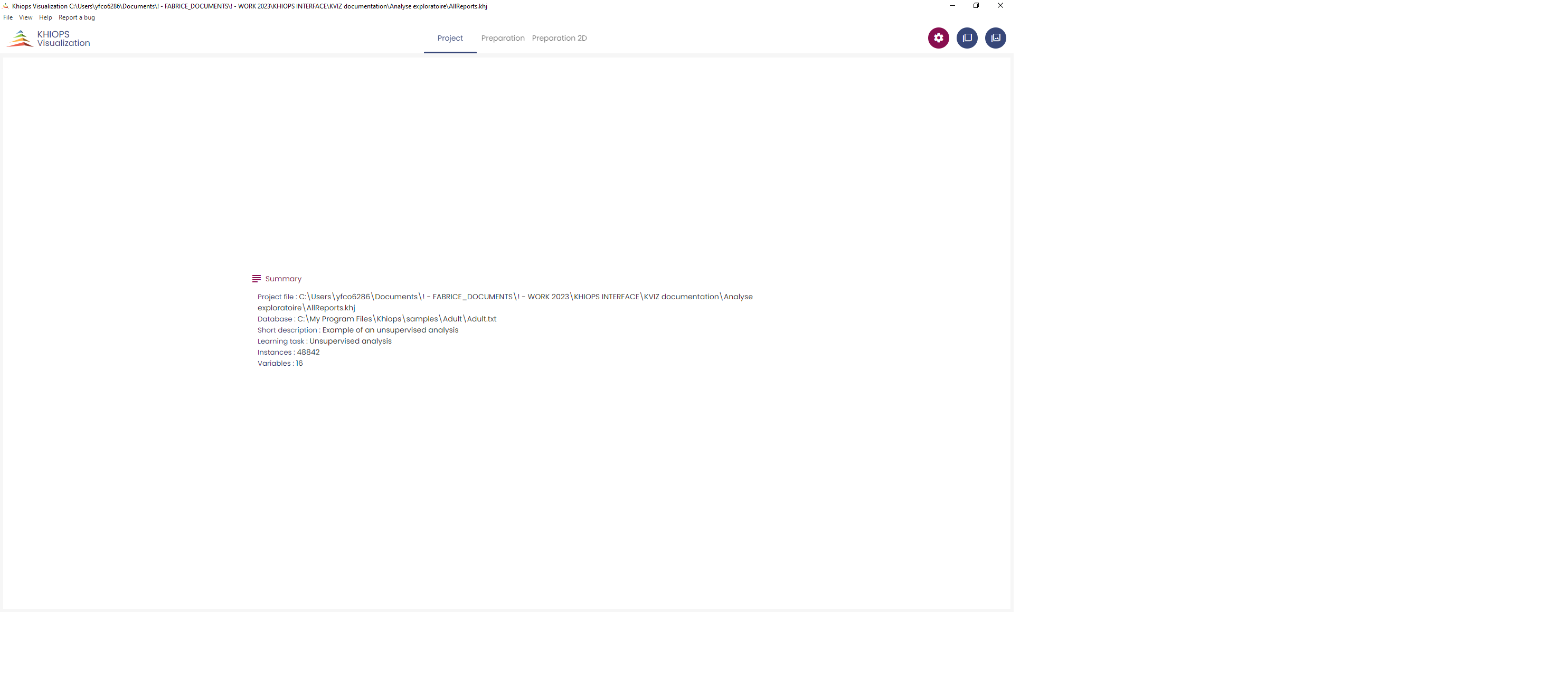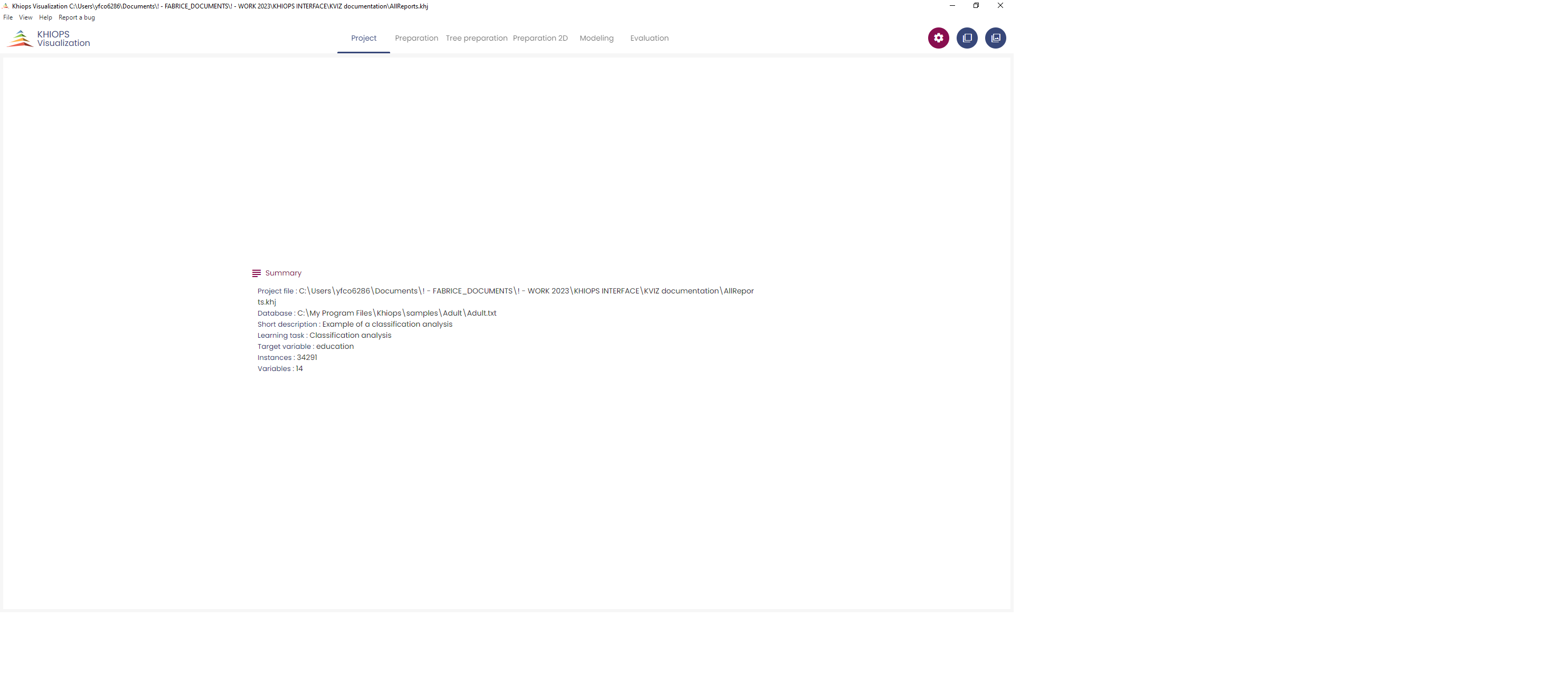 The entry point of Khiops Visualization is the khj file generated by Khiops at the end of the analysis. A double-click on this file opens Khiops Visualization.