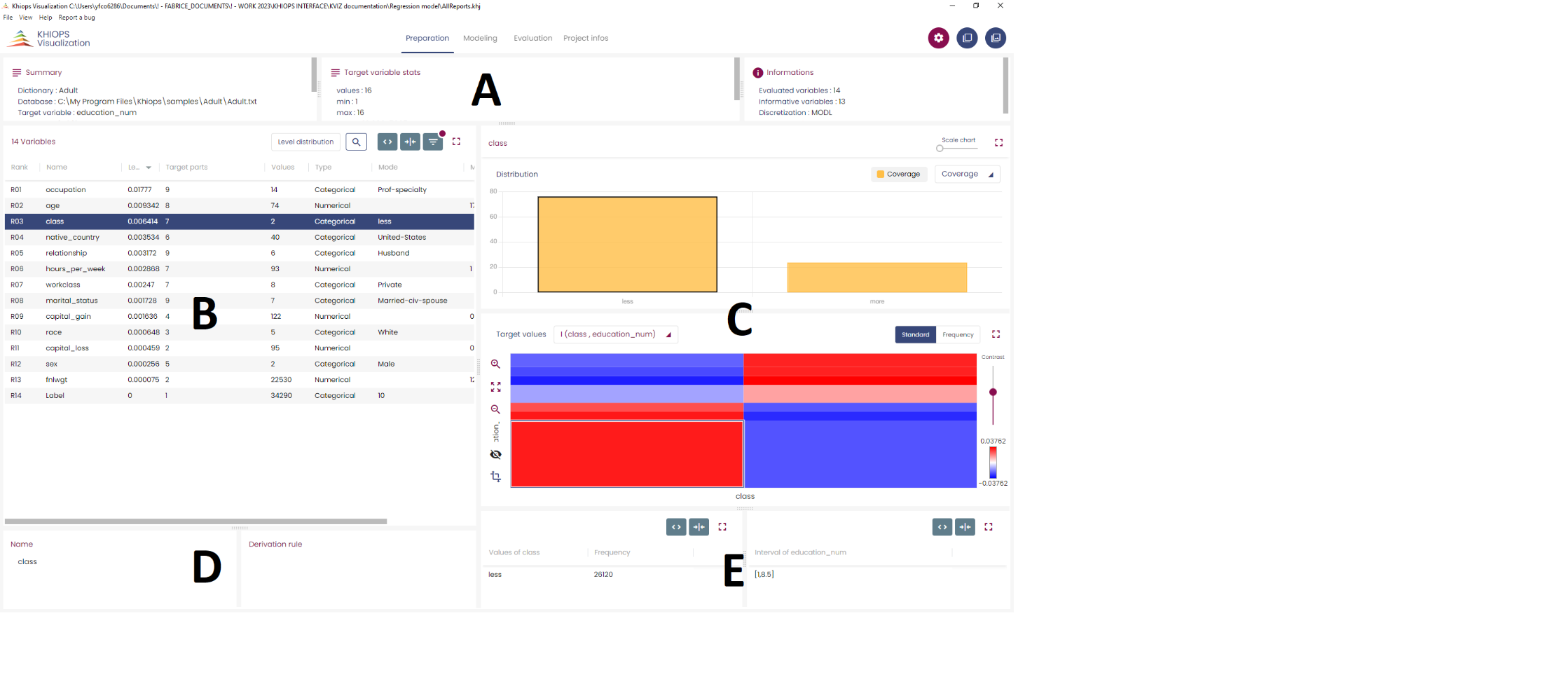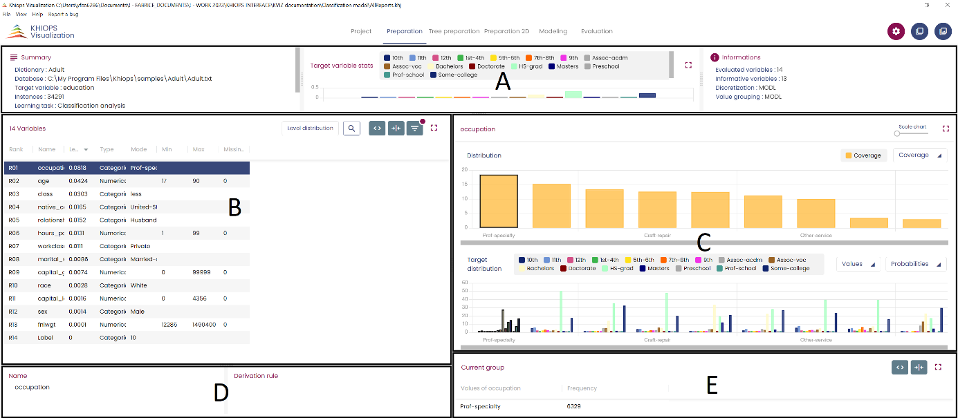 Clicking on a line of the table in panel B displays the information about the parts obtained from the optimal supervised grouping the selected variable selected in panel C and information about the variable (Name and derivation rule(if any)) in panel D.