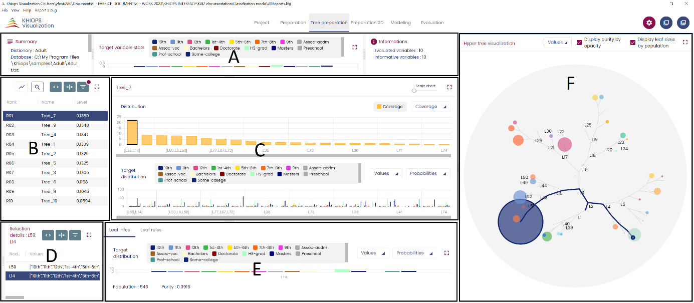 The left panel (panel F) is a hypertree visualization of the selected decision tree. Only terminal leaves are clickable ; clicking on a leaf dynamically points to the relevant leaf and group of leaves information in the other panels. The population and purity of the leaves can be visualized by their size and color density. This can be toggled on and off and the "values" menu allows to select some of the target modalities only.