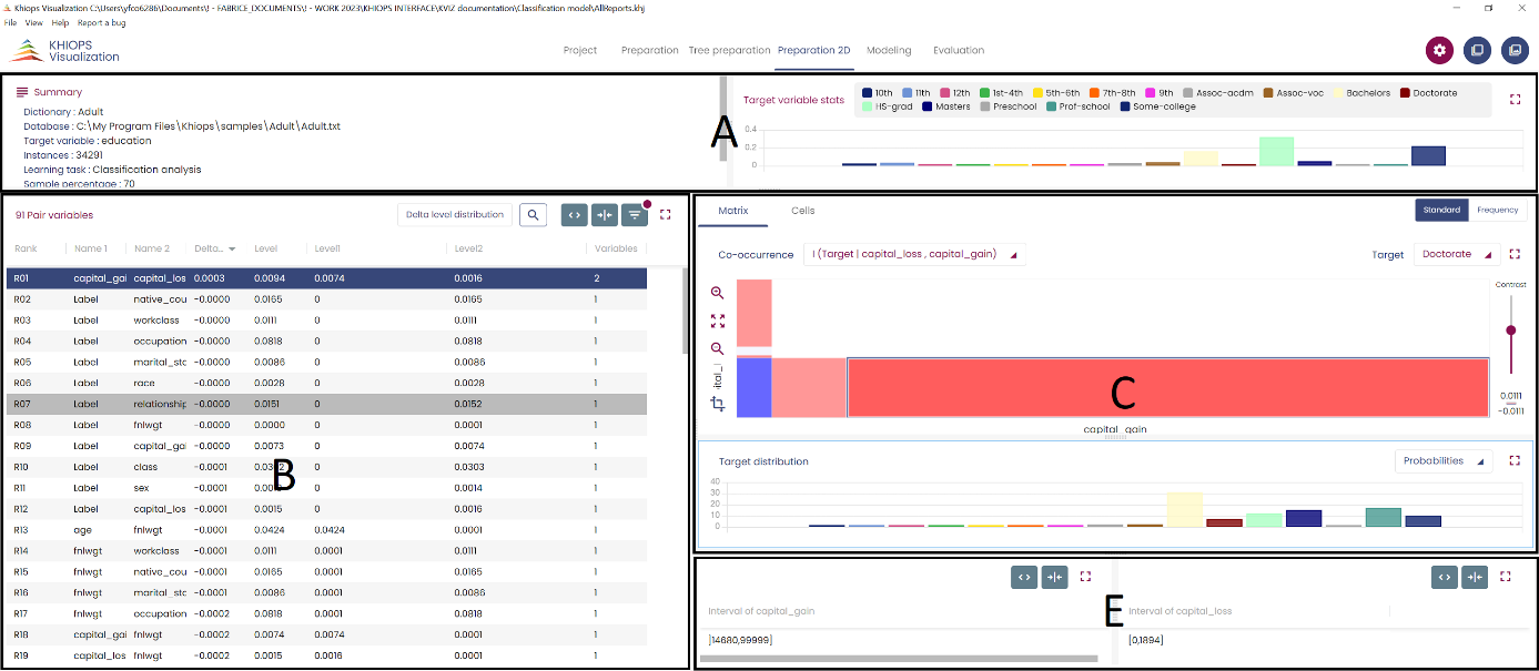The general layout is similar to the Preparation tab, except for panel C which shows the bivariate supervised discretization of the pair selected in panel B.