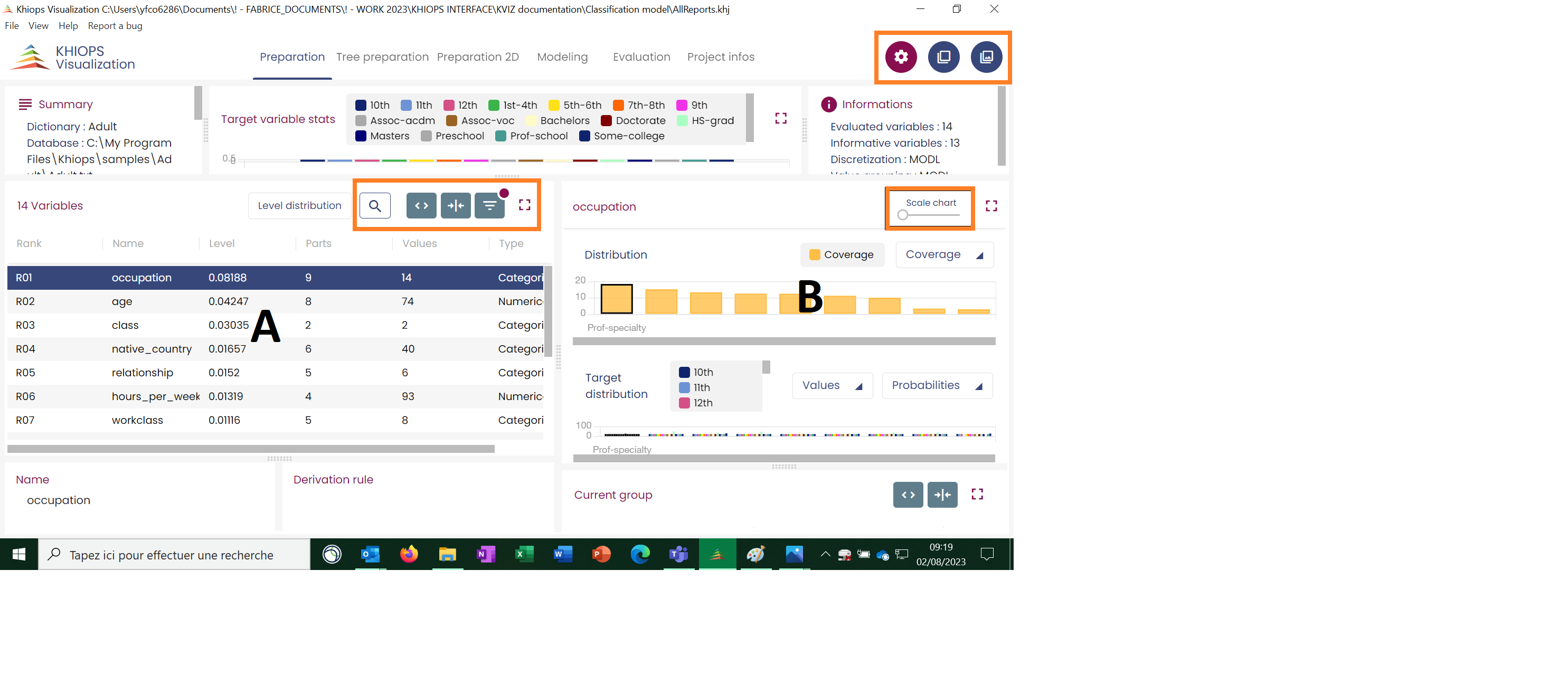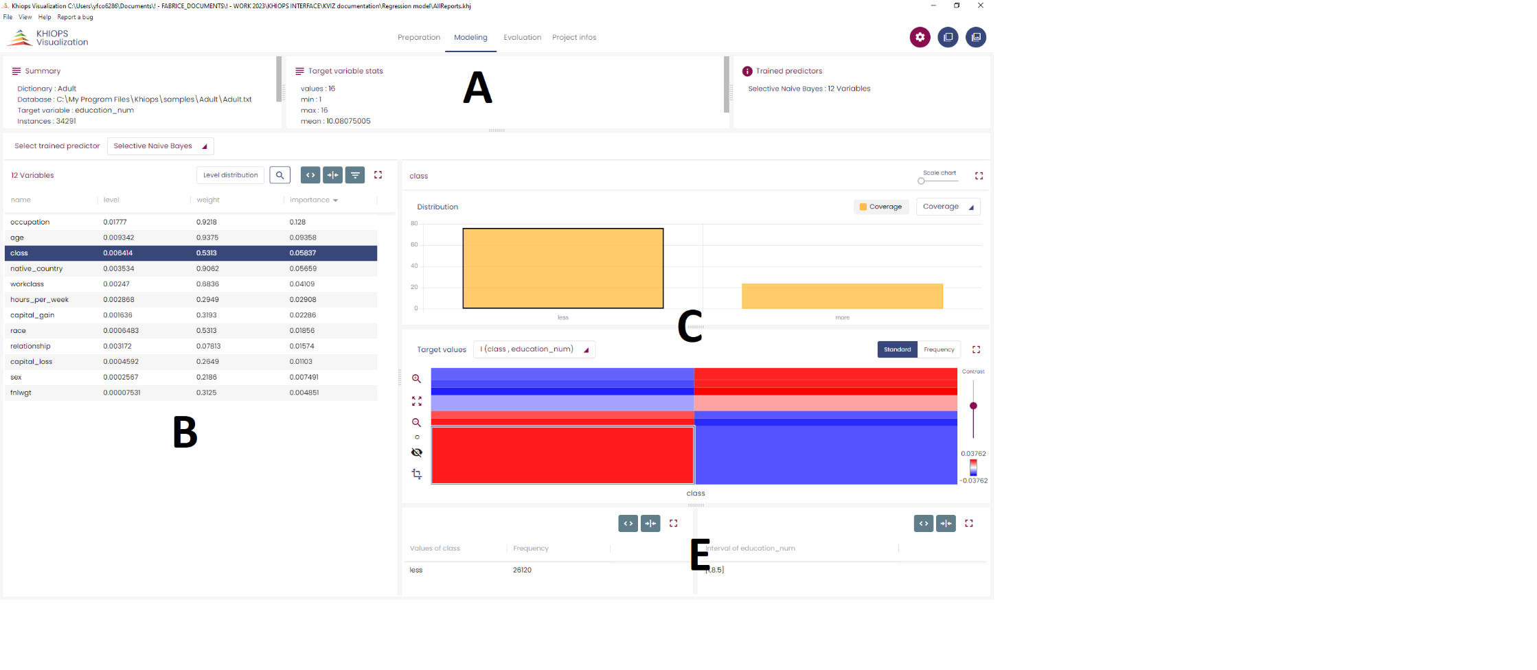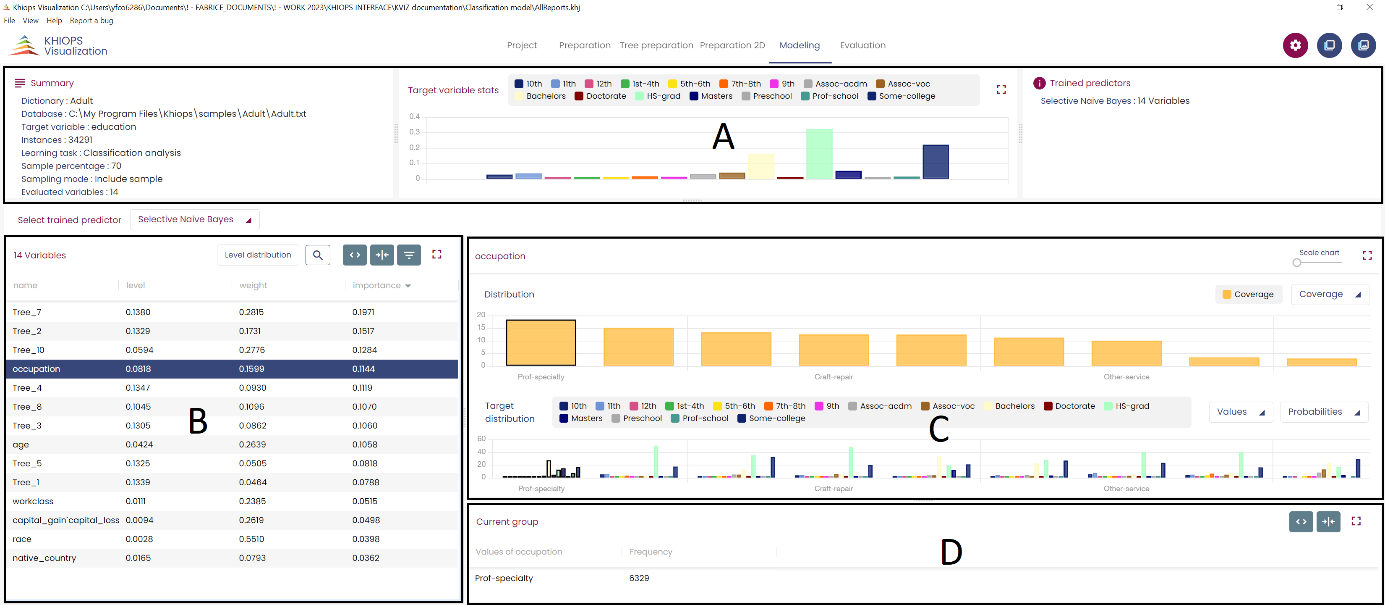 The general layout is similar to the Preparation tab. Panel B shows information related to those variables used in the model only. The table shows for each variable its level, weight (in the weighted naive Bayes model) and its importance (computed as the geometric mean of the level and the weight).