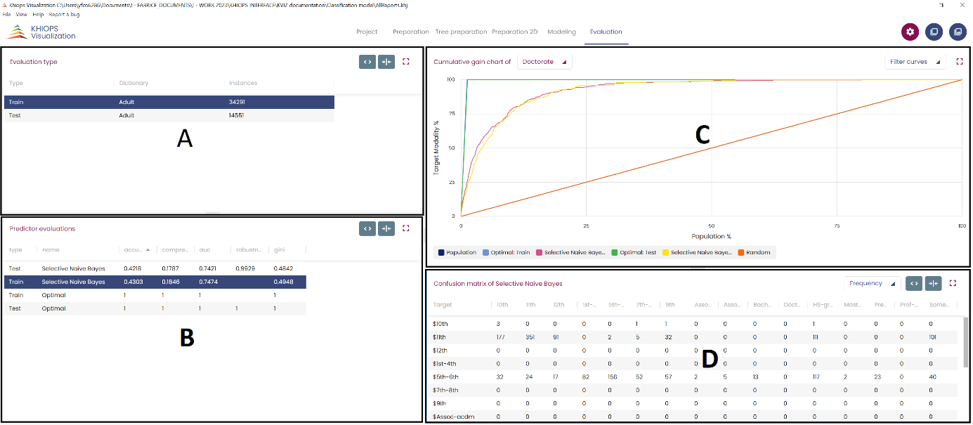 Depending on the analysis type, the panes and their contents are not the same. Khiops Visualization can be composed with 5 panels: