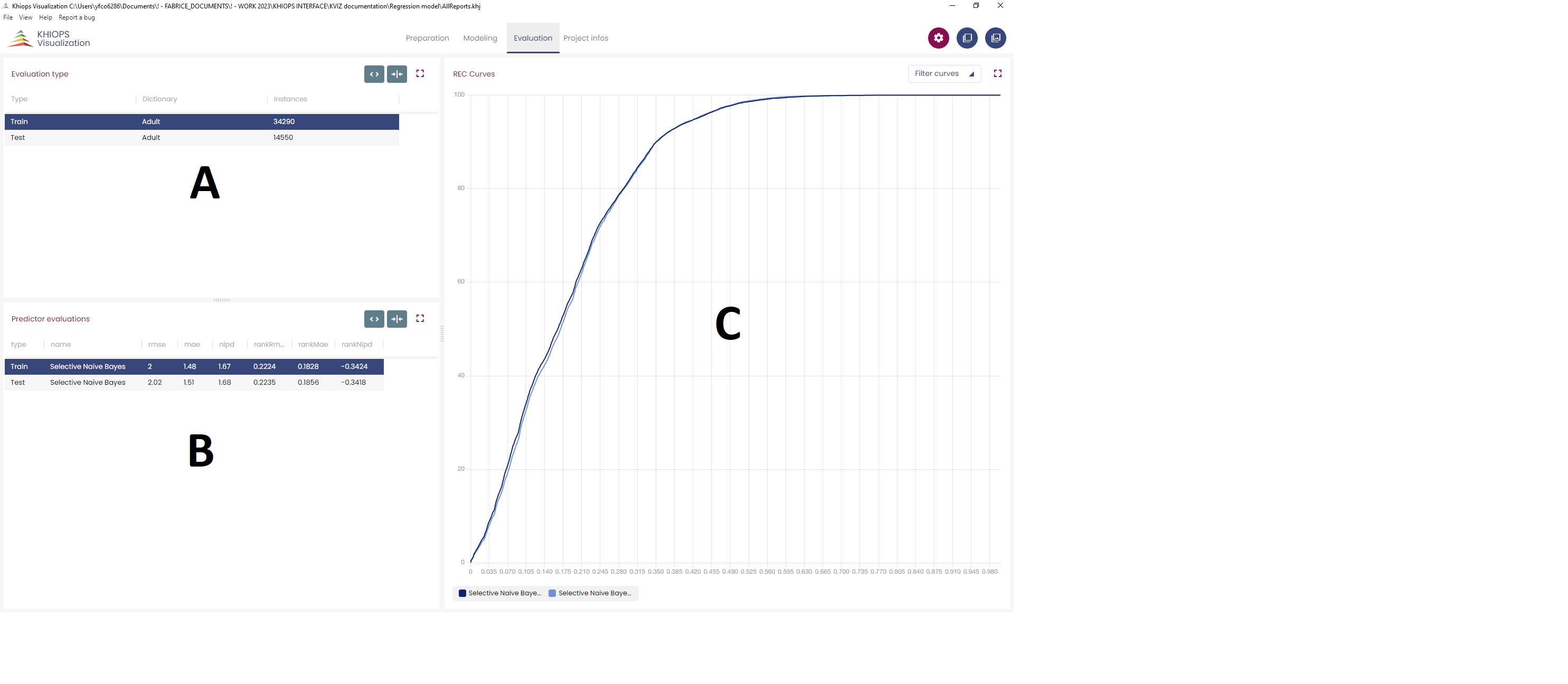 Evaluation: displays on one panel the test, train and evaluation reports.