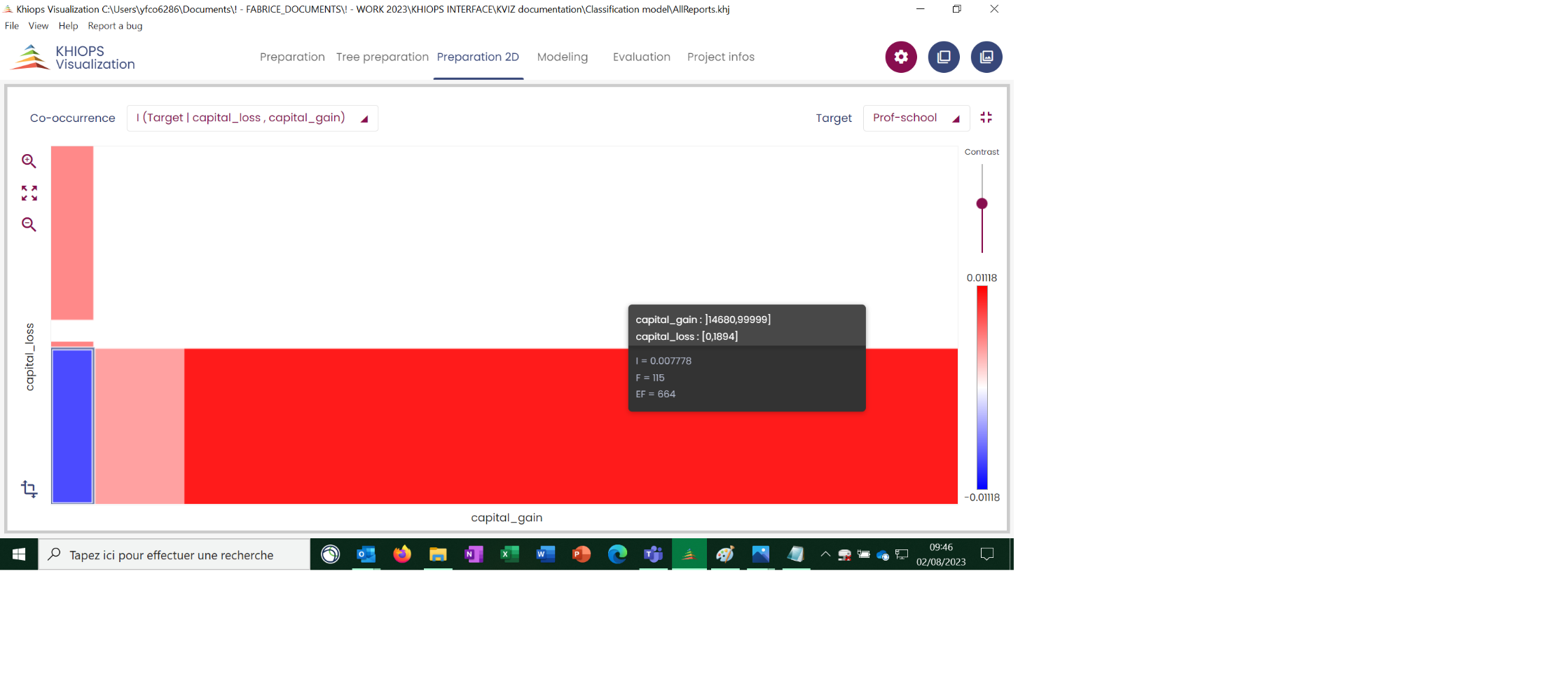 This discretization is the cartesian product of the parts for each variable. By default, the information displayed on the subtab "Matrix" is the mutual information between a cell of the cartesian product and a modality of the target variable (selected from the "Target" menu), allowing to analyze the information brought by the variables as a pair to the target variable. Other information such as the frequencies in each cell can be selected from the menu.