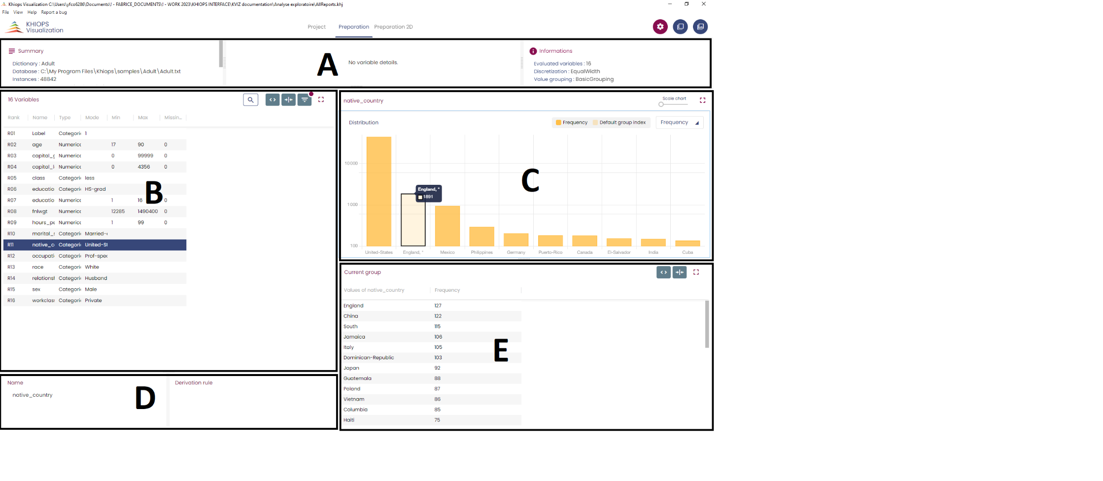 The figure above shows the histogram of the variable "native_country" which has 41 modalities. The default group is selected, and its content is displayed in panel E.