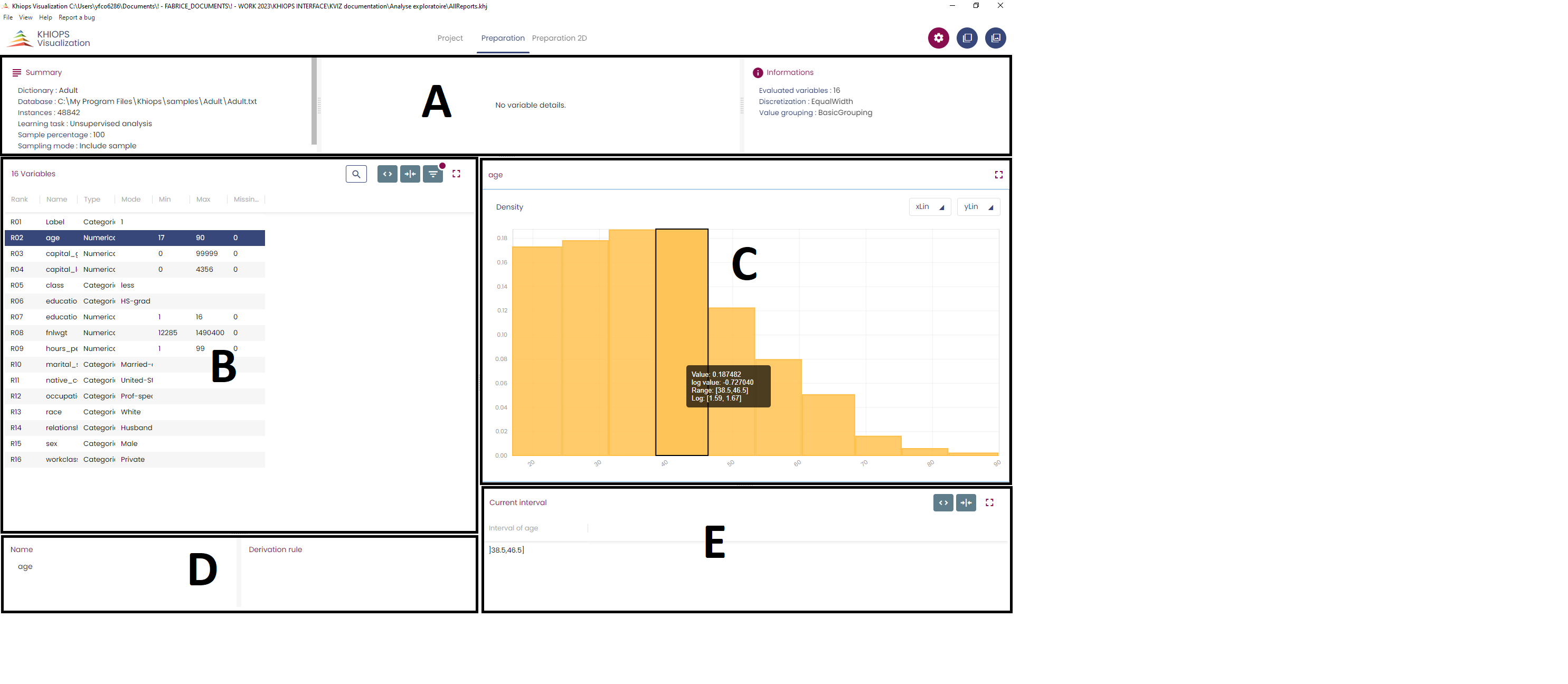 Clicking on a line of the table in panel B displays the histogram of the corresponding variable in panel C and information about the variable (Name and derivation rule (if any)) in panel D. Clicking on a bin of the histogram displays information about this bin in panel E.