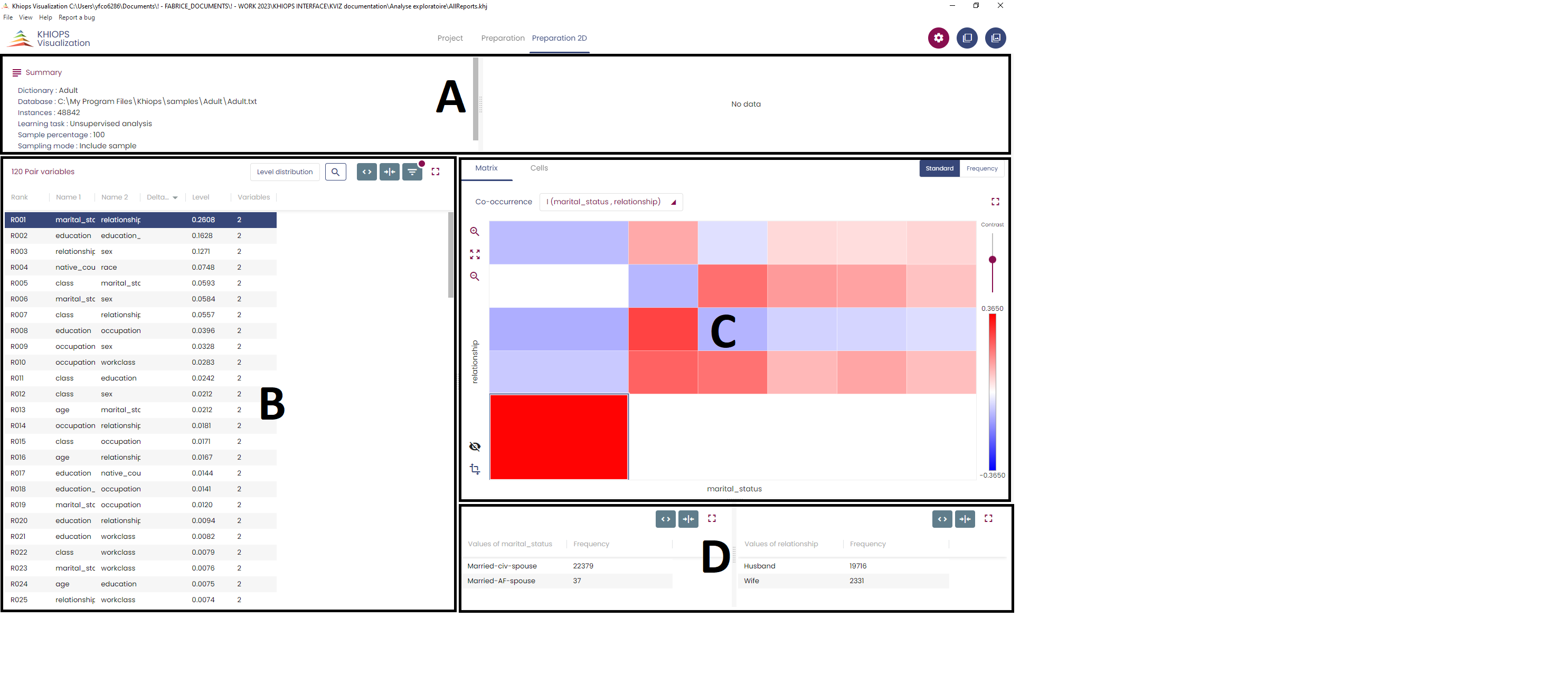 The general layout is similar to the Preparation tab, except for panel C which shows the bivariate discretization of the pair selected in panel B.